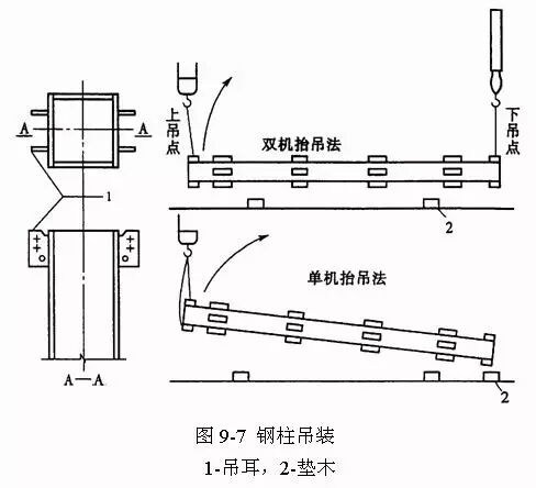 钢柱的吊点在吊耳处(柱子在制作时于吊点部位焊有吊耳,吊装完毕再割去)。根据钢柱的重量和起重机的起重量,钢柱的吊装可用双机抬吊或单机吊装(下图)。单机吊装时需在柱子根部垫以垫木,以回转法起吊,严禁柱根拖地。双机抬吊时,钢柱吊离地面后在空中进行回直。